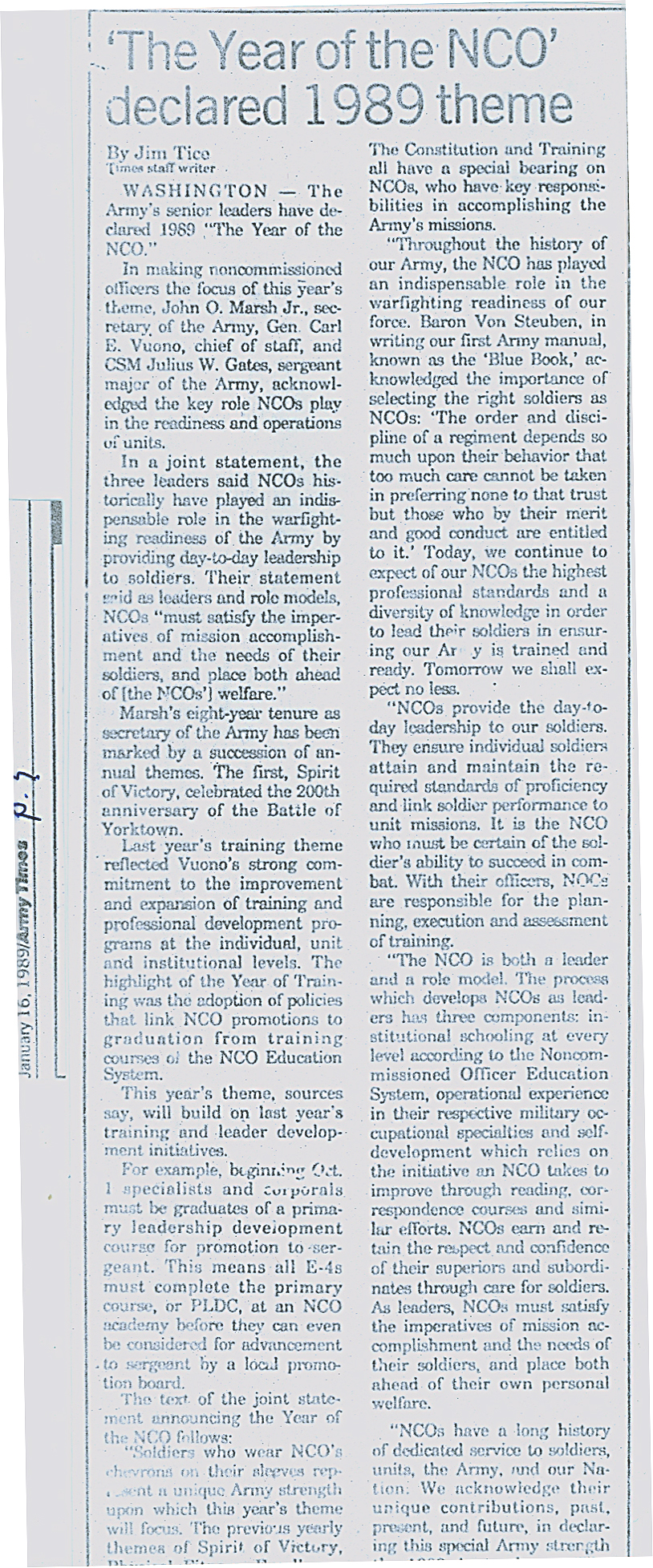 The Year of the Noncommissioned Officer, revisited. 1989, the first Year of the NCO, was announced by Secretary of the Army John O. Marsh by memorandum entitled, The 1989 Army Theme: The NCO. Now for the second time in 20-years, the Army will again highlight the significance of its professional enlisted force, the noncommissioned officer